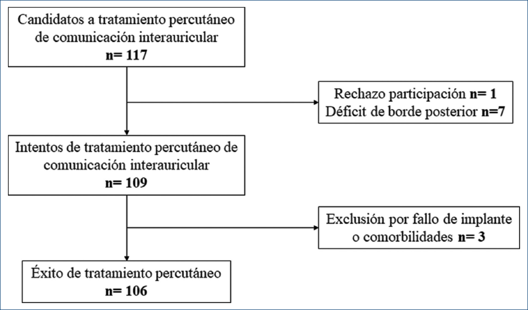 Estudio observacional, prospectivo y comparativo de mediciones repetidas. Desde julio de 2020 a noviembre de 2023, se evaluaron 117 pacientes con CIA tipo ostium secundum programados para tratamiento percutáneo. De ellos, 106 pacientes fueron finalmente incluidos en el estudio. Las causas de exclusión de los 11 pacientes restantes fueron rechazo a participar en un caso (0.85%) y en los otros 10 casos debido a falta de implante del dispositivo durante el procedimiento (8.5%) (Fig. 1). Las indicaciones de tratamiento percutáneo fueron dilatación de cavidades derechas y/o síntomas clínicos de insuficiencia cardiaca derecha. Todos los pacientes o sus tutores autorizaron mediante firma de consentimiento la participación en el estudio, el cual fue aprobado por el comité de investigación y de ética institucional.