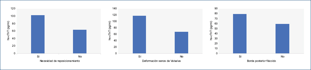 Figura 2 Gráfico de barras comparando mediana de hs-cTnT a las 6 horas del procedimiento entre variables categóricas. Necesidad de reposicionamiento del dispositivo 63.4 pg/ml vs. 102.2 pg/ml (p < 0.01) (izquierda). Deformación de senos de Valsalva 67.6 pg/ml vs. 117.3 pg/ml (p = 0.03) (centro). Borde posterior fláccido 59.5 pg/ml vs. 79.5 pg/ml (p = 0.06) (derecha). Test U de Mann-Whitney. hs-cTnT: troponina T cardiaca de alta sensibilidad.
