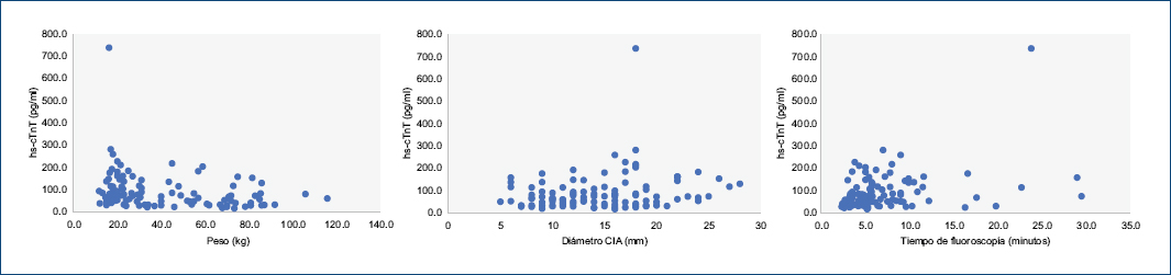 Figura 3 Gráfico de dispersión correlacionando valor de hs-cTnT y variables continuas. Correlación entre peso y hs-cTnT (r: –0.25; p < 0.01) (izquierda). Correlación entre diámetro de CIA y hs-cTnT (r: 0.20; p = 0.03) (centro). Correlación entre tiempo de fluoroscopia y hs-cTnT (r: 0.34; p < 0.001) (derecha). Test de correlación de Pearson. CIA: comunicación interauricular; hs-cTnT: troponina T cardiaca de alta sensibilidad.