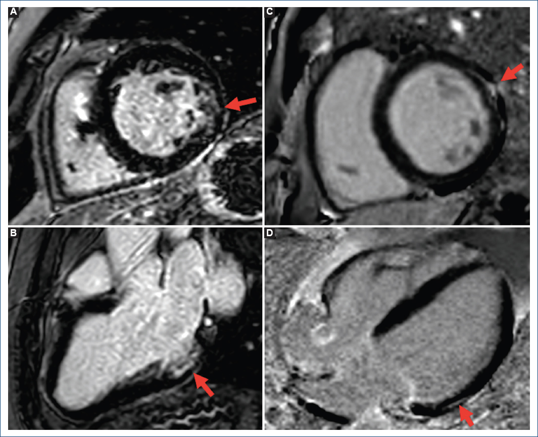 Figura 1 A y B: resonancia magnética (RM) del caso índice, secuencias de realce tardío de gadolinio (RTG), eje corto y eje largo, que muestra fibrosis subendocárdica del 60% inferolateral. C y D: resonancia magnética de la madre del caso índice, secuencias de realce tardío de gadolinio, eje corto y eje largo, que muestra fibrosis lineal intramiocárdica lateral basal.