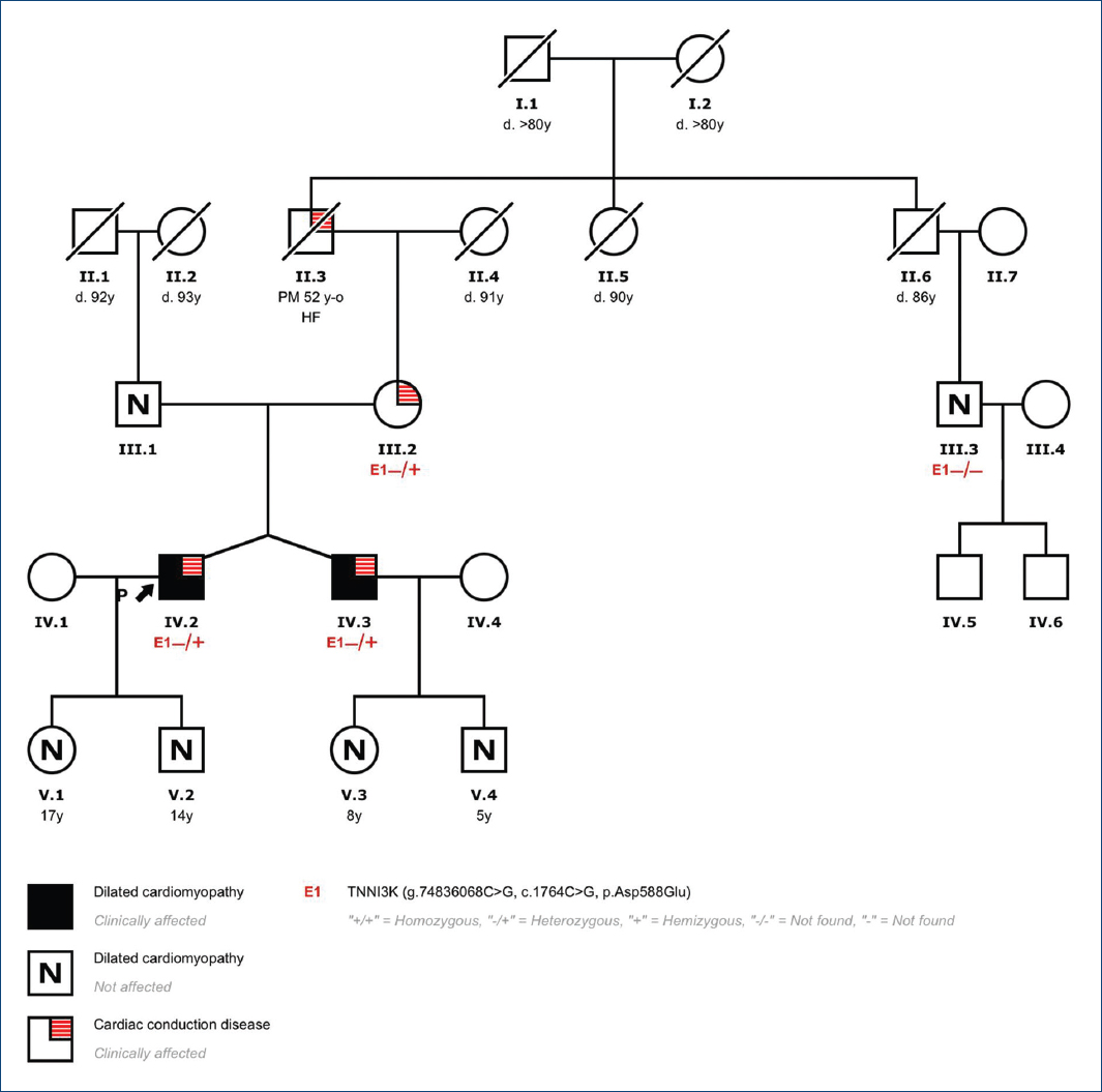 Presentamos el caso de una familia con una historia de trastornos de la conducción cardiaca y miocardiopatía asociada en la que se identificó una mutación no descrita en el gen TNNI3K.