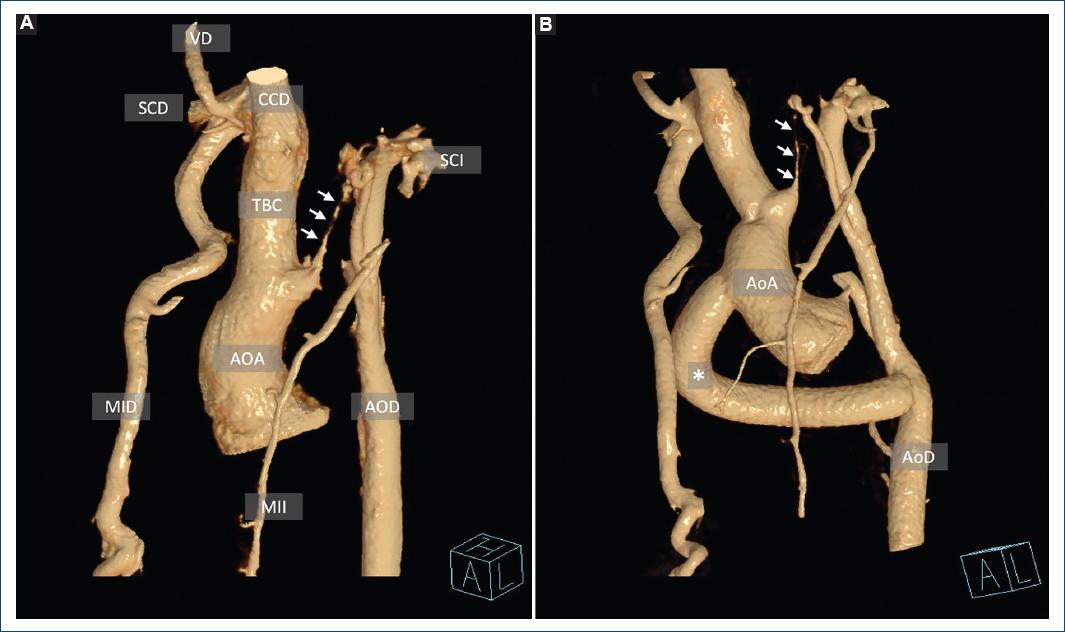 Figura 1 Reconstrucciones tridimensionales con renderización volumétrica en el eje oblicuo anterior izquierdo. A: prequirúrgico, con arco aórtico gravemente hipoplásico (flechas). Importante dilatación de la arteria mamaria interna derecha (MID) y de la subclavia izquierda (SCI). B: posquirúrgico, con injerto de Gore-tex (asterisco) de la aorta ascendente (AOA) a la aorta descendente (AOD). CCD: carótida común derecha; MII: mamaria interna izquierda; SCD: subclavia derecha; TBC: tronco braquiocefálico derecho; VD: vertebral derecha.