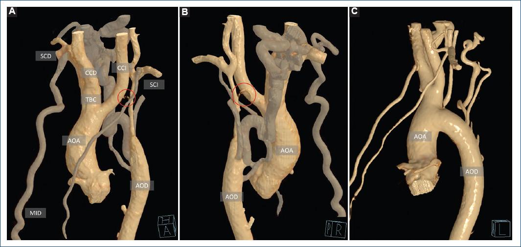 Figura 2 Reconstrucciones tridimensionales con renderización volumétrica en el eje oblicuo anterior izquierdo (A), lateral derecha (B) demostrando la anatomía prequirúrgica y lateral izquierda (C) tras la corrección quirúrgica. Se observa la circulación colateral en colores opacos resaltando la aorta y sus ramas principales. Arco aórtico gravemente hipoplásico (círculo rojo). AOA: aorta ascendente; AOD: aorta descendente; CCD: carótida común derecha; CCI: carótida común izquierda; MID: mamaria interna derecha; SCD: subclavia derecha; SCI: subclavia izquierda; SCI: subclavia izquierda; TBC: tronco braquiocefálico.