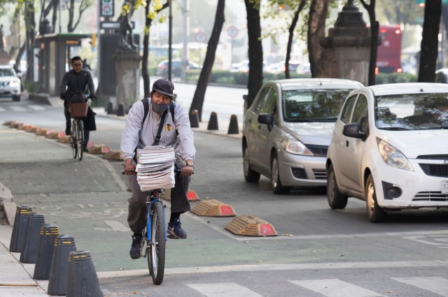 Prometeo Lucero ( Repartidor de periódicos trabaja en bicicleta en la avenida Reforma, Ciudad de México, 21 de octubre de 2020.