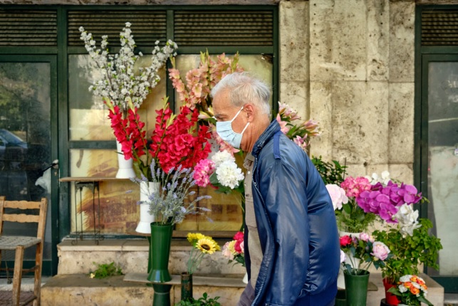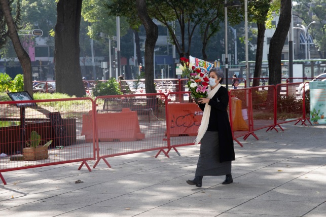 Prometeo Lucero ( Mujer camina con arreglo floral en los alrededores del Senado de la República, Ciudad de México, 7 de octubre de 2020.