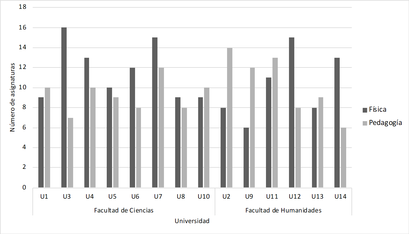 Las carreras de Pedagogía en Física identificadas tienen una duración de nueve o diez semestres. A partir de la información disponible para cada institución, se contabilizaron las asignaturas que se imparten por área de conocimiento. La proporción de asignaturas que cada programa formativo incluye se distinguió de acuerdo con las siguientes áreas: Física, Educación y Psicología, Didáctica (generales o específicas), Naturaleza de las Ciencias, Matemática, Prácticas Pedagógicas e Investigación Educativa. En cada área se han considerado también asignaturas llamadas “Taller de…”. Además, cabe señalar que no se incluyeron en este análisis las asignaturas de formación complementaria, por no ser de carácter permanente.
