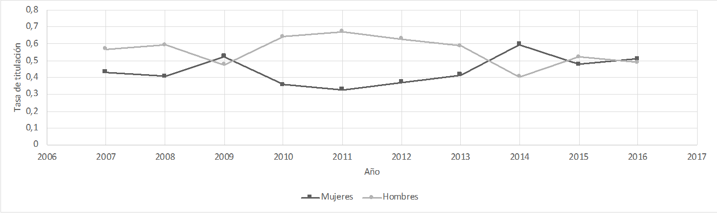 Si bien las carreras de pedagogía suelen tener mayor porcentaje de estudiantes mujeres en Chile (Ávalos, 2003), se observa que en el caso de Física, como disciplina, la carrera de formación docente tiene predominio de estudiantes hombres, tanto en la tasa de matrícula como en la de titulados. Sólo un 42% de los estudiantes que ingresaron a estudiar la carrera en el período 2007-2017 son mujeres, lo que contrasta con el índice a nivel nacional donde, en 2017, un 74% de los estudiantes matriculados para estudiar carreras en el área de Educación, son mujeres (CNED, 2017).