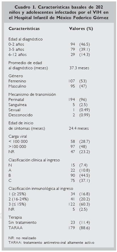 El diagnóstico de infección por VIH/SIDA se efectuó en promedio a los 37 meses de edad, cursando la mayoría con enfermedad avanzada; 88.6% de los pacientes recibían TARAA al momento del estudio (Cuadro 1).