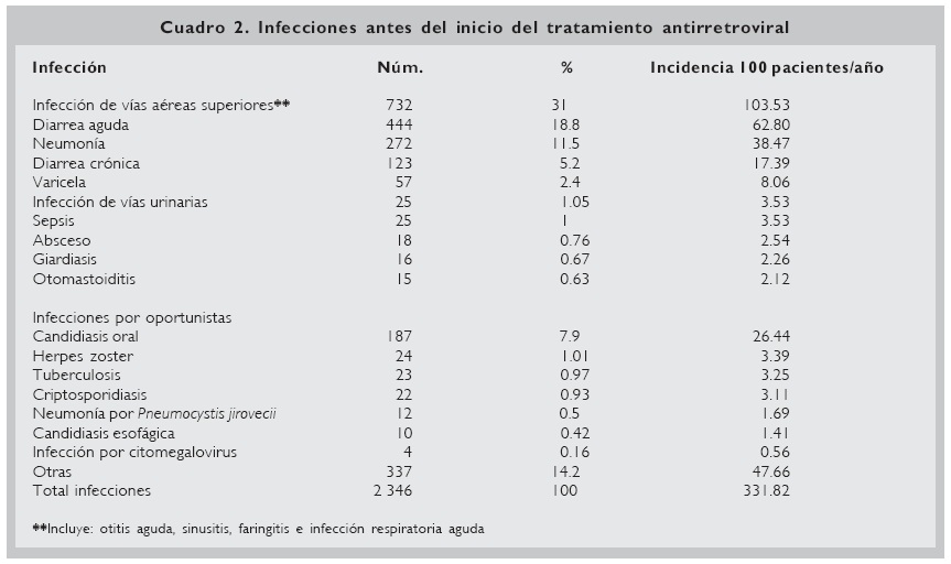 Del total de la cohorte, los pacientes cursaron con 2 346 episodios infecciosos previos al diagnóstico de infección por VIH/SIDA, con una incidencia de 331.82/100 pacientes/año, con un promedio de 11.6 infecciones/paciente, siendo las más frecuentes en vías respiratorias y las gastrointestinales. Las infecciones por gérmenes oportunistas correspondieron a 11.9% del total de las infecciones, predominando candidiasis oral, herpes zoster y tuberculosis (Cuadro 2).