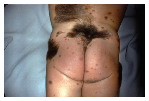 Los NMCG pueden afectar cualquier área anatómica, incluyendo la piel cabelluda. La localización más frecuente es el tronco (47%), seguido de las extremidades (30%) y la cabeza (22%). Las lesiones pueden ser únicas o, más frecuentemente, múltiples. Hasta el 78% de los pacientes presentan lesiones satelitales (NMC pequeños), que cuando son numerosos (por lo general más de 20), aumentan el riesgo de melanoma o melanosis neurocutánea (MNC)2,6,10,13.