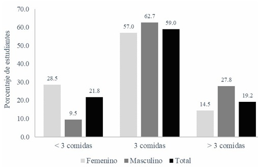 De acuerdo con el análisis descriptivo de los hábitos alimentarios, el 59.0% de los estudiantes evaluados consumían tres comidas al día, siendo mayor la proporción de hombres que consumían 3 comidas al día que mujeres, 62.7% y 57.0%, respectivamente. Sin embargo, el 21.8% de los estudiantes consumían menos de tres comidas al día, siendo las mujeres en mayor proporción que los hombres (28.5% vs 9.5%) (Figura 1).