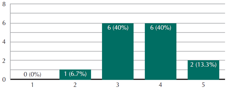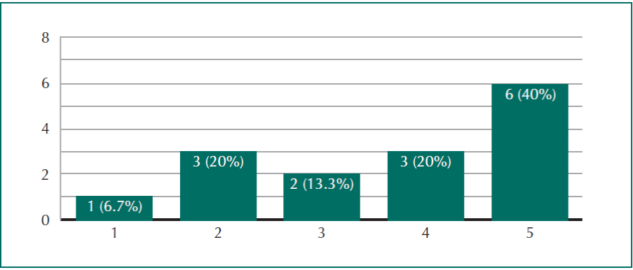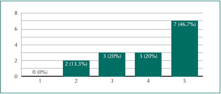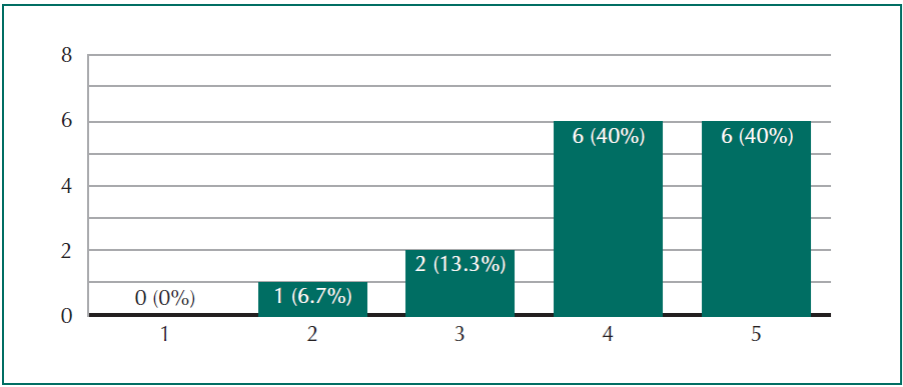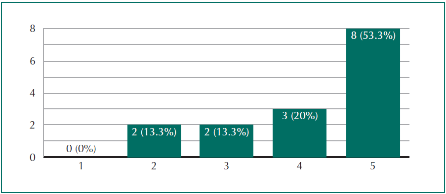 La quinta cuestión sometía a evaluación el interés que sobre los estudiantes despierta la participación de asesores externos durante el desarrollo de los talleres internacionales (Figura 16). Este instrumento pedagógico obtiene un valor medio de 3.67 sobre 5, y la ausencia de comentarios que maticen esta valoración en concreto dificulta su interpretación, si bien debe entenderse como ciertamente positiva al superar con creces el valor intermedio de 2.5.