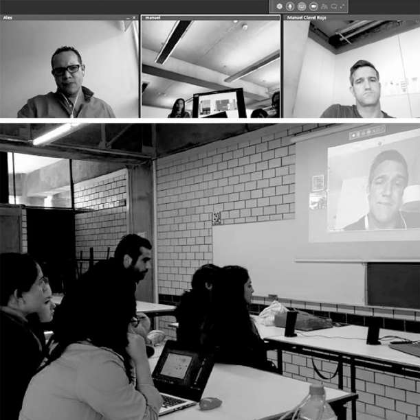 En cualquier caso, el contacto con la empresa privada -firma internacional de arquitectura- comienza a forjarse de manera progresiva, con sesiones concertadas de videoconferencia entre los alumnos y los docentes en España (véase Figura 6), así permiten la coordinación internacional de los talleres.