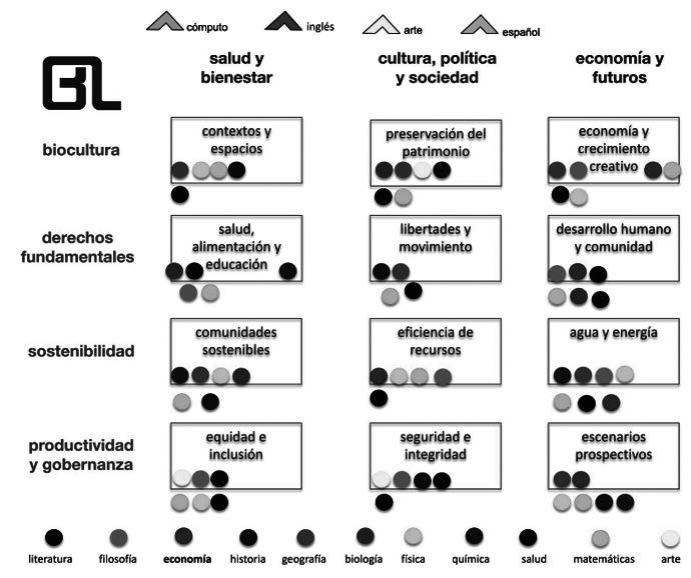 En cada asignatura concurren tres o cuatro disciplinas centrales (círculos dentro de los recuadros), una a tres disciplinas complementarias (círculos fuera de los recuadros) y las cuatro asignaturas transversales (inglés, cómputo, arte y español).