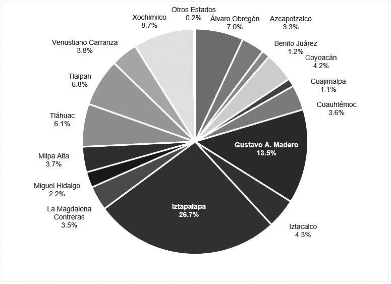 En cuanto al lugar de residencia, destacan las Alcaldías Iztapalapa y Gustavo A. Madero, en las que residen 26.7 % y 13.5 % de los estudiantes, respectivamente (véase la Figura 5). En conjunto, en estas alcaldías se agrupa 40.2 % del total de los estudiantes.