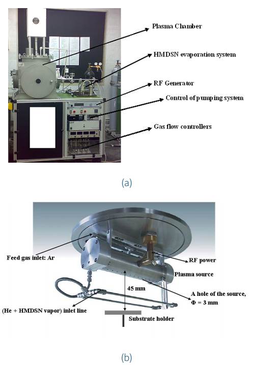 Figure 1 (a) Plasma deposition system of HMDSN thin films. (b) View of the plasma source, feed gas inlet, Hexamethyldisilazane (HMDSN) vapor inlet, and the position of the substrate holder inside the plasma chamber.
