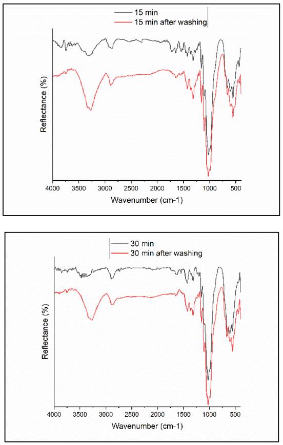 Figure 10 FTIR spectra for a) 15 min treated sample, and b) 30 min treated sample before and after washing.