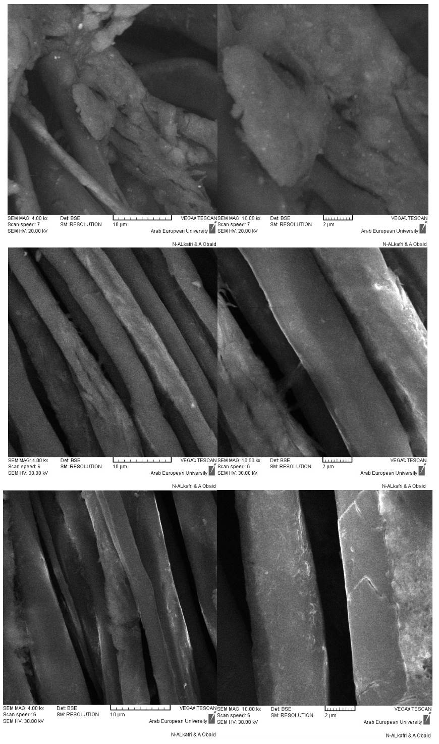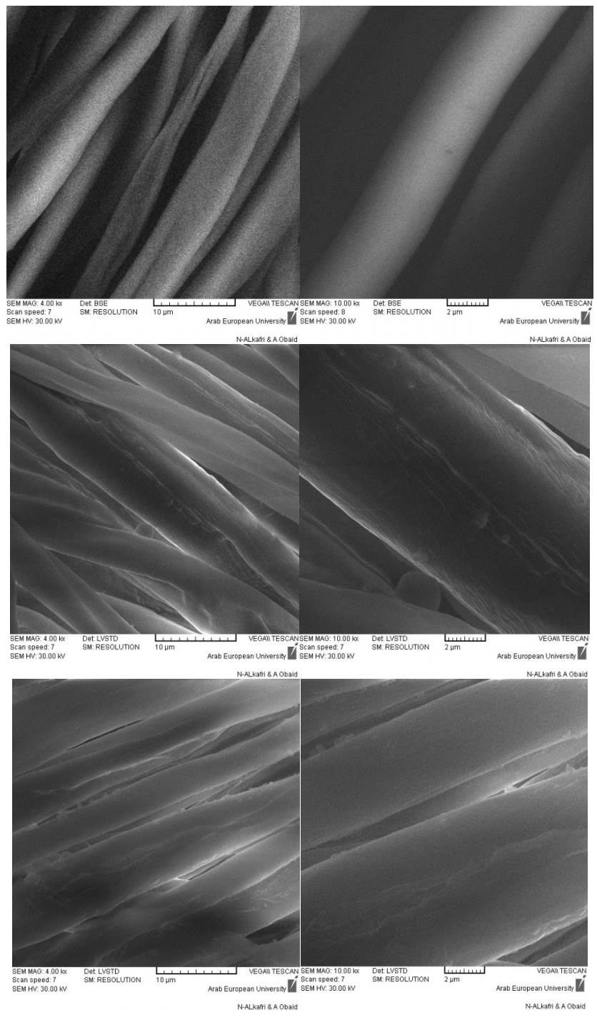 Fig. 2 highlights the surface morphology of the samples, whereas Fig. 2 (a, b) displays the surface fibers of the untreated sample. Meanwhile, Fig. 2 (c, d) and Fig. 2 (e, f) exhibit the deposited film on the 15 min and 30 min treated samples, respectively. Fig. 3 outlines the thickness of the deposited film on the treated samples, with measurements of 18 and 54 nm for 15 min and 30 min treated samples, respectively.