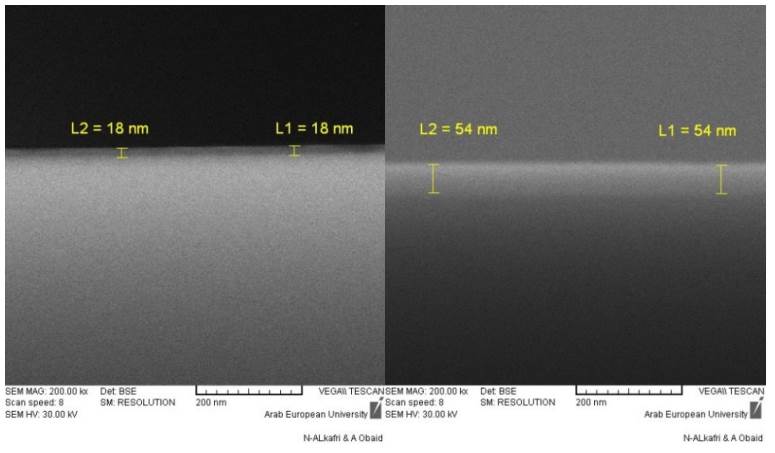 The surface morphology of the samples and film thickness were analyzed using a scanning electron microscope (Vega II XMU Teskan SEM) at up to 10,000x magnification.