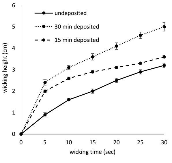 The results of the wicking experiment are presented in Fig. 4, revealing that the treatment has improved the fabric's ability to absorb water. This improvement is due to the formation of polar groups on the fabric's surface. As a result of the plasma process, the monomer undergoes breakdown into smaller chemical components and free radicals through inelastic collisions. These ions then break down the side groups and hydrogen bonds present at the ends of the cellulose chain when they penetrate the polymeric film. The free radicals generated during this process become trapped in the structure and react with oxygen in the atmosphere, resulting in the creation of polar groups within the film structure (Kodaira et al., 2015).