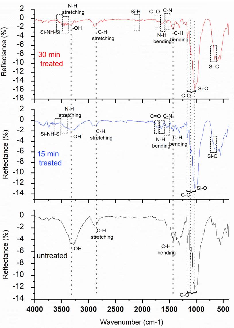 Functional groups like -NH2, C=O, and C-N contribute to an increase in wettability. Regarding Si-H, it only appears in the 30 min treated sample, not in 15 min treated sample. This may be due to the FTIR technique's limited sensitivity in detecting nanometric chemical changes.