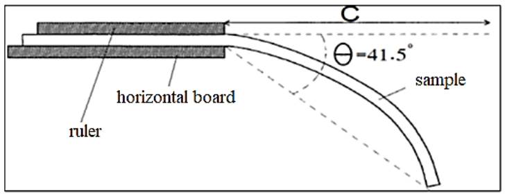 This test was conducted following ASTM D1388-96 (2002) standard. The sample with defined dimensions was placed on a flat surface and a graduated ruler was positioned above it, as depicted in Fig. 6. The ruler was gradually pushed forward, propelling the sample until its bent end met the line inclined at a 41.5° angle from the horizontal. Six to eight seconds later, the measurement on the ruler was taken, which indicated the bending length of the sample. Finally, Eq. (3) was used to calculate the stiffness: