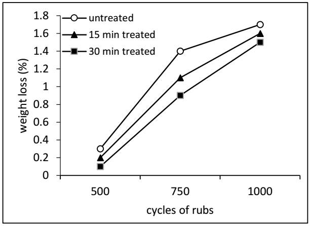 Fig. 7 displays the weight loss of the samples after undergoing the abrasion test. The findings reveal that weight loss progressively increases with the number of Martindale cycles. As it was noted, the treatment resulted in decreased weight loss, thanks to the thin PECVD coating that was applied to the sample, which helped to decrease the weight loss of the sample.