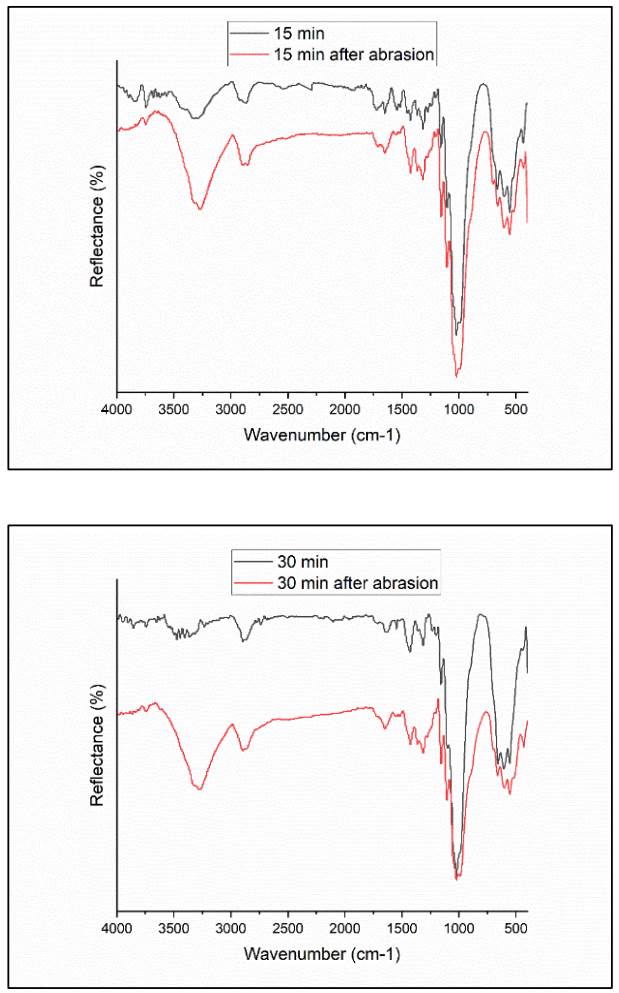 Figure 8 FTIR spectra for a) 15 min treated sample, and b) 30 min treated sample before and after 1000 cycles of rubs.