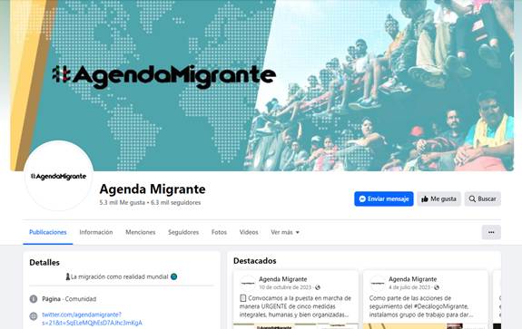 En “Destacados”, Facebook fija publicaciones a las que se quiere conceder relevancia visual, para que sean lo primero que se lea; aquí, son copias de los comunicados de prensa en que la ONG convoca (en plural: “convocamos”) “a la puesta en marcha de manera urgente de cinco medidas integrales, humanas y bien organizadas para la atención del fenómeno migratorio en la región” (Agenda Migrante, 2023, párr. 1). Estos documentos hablan más del “fenómeno migratorio” como problema que de las personas mismas. En su comunicado fijado el 10 de octubre de 2023, Agenda Migrante señaló: “Considerando las recientes muertes de personas migrantes en accidentes carreteros en su intento por llegar a la frontera mexicana con Estados Unidos en condiciones precarias de transporte, aumentando los riesgos y peligros para su traslado” (Agenda Migrante, 2023, párr. 8).