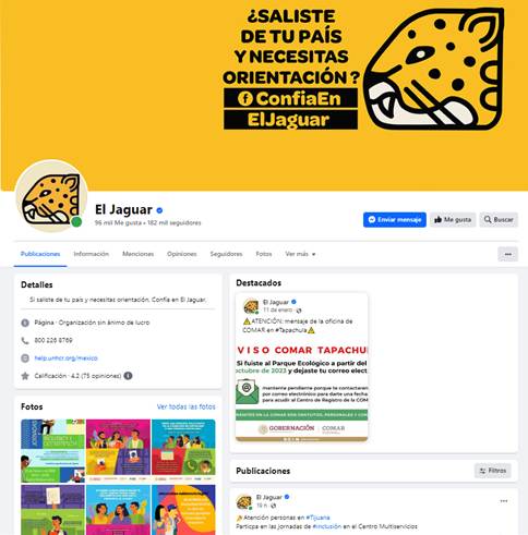 En EJ se observa más interacción con los seguidores, muchos de los cuales brindan indicios de ser migrantes que responden al ofrecimiento de asesoramiento gratuito y gestión de apoyo de esta ONG, una intermediaria entre aquellos y otras organizaciones, como ACNUR, o con la burocracia estatal (como la Comisión Mexicana de Ayuda a Refugiados [COMAR]). A diferencia de AM, EJ promociona también actividades culturales de inclusión. Su orientación asistencialista se detecta desde la portada misma que, mediante una pregunta directa con tuteo, se dirige al migrante, definido a partir de la necesidad “de orientación” y de la salida de su país; hay también un pedido de confianza, estructurado como etiqueta, para facilitar la búsqueda de contenido y su amplificación: “#ConfíaEnElJaguar” (figura 2).