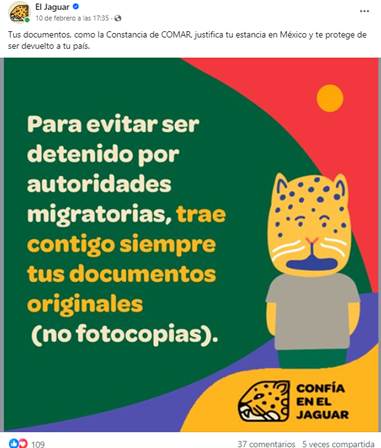 Además, se observan varios mensajes protagonizados por el alter ego de la ONG, un jaguar, por momentos en forma de logo, lo que confiere un carácter institucional y, por otros, como ilustración o caricatura. En esos casos (por ejemplo, en la figura 3), el mensaje es directivo (“trae contigo siempre tus documentos”) y la voz, de autoridad, pero el dibujo actúa como el equivalente a un marcador lingüístico de cortesía (Brown y Levinson, 1987, p. 177): mitiga la fuerza de la imposición.