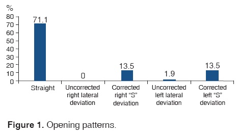 In the present study, opening patterns differed significantly. Most children exhibited a straight opening pattern, followed by greater prevalence of corrected left and right deviation.