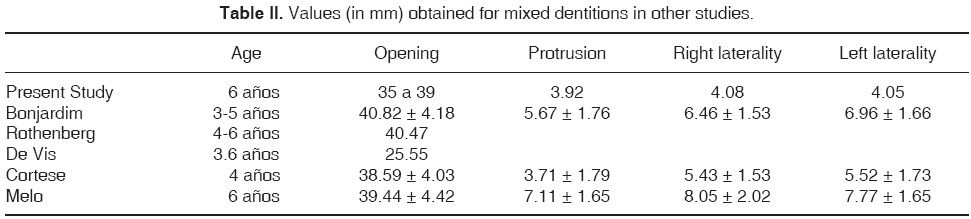 Due to ethnicity, weight and stature differences, mandibular movements found in six year old Mexican child population differed from similar studies conducted on same age children in other regions. In the present study only six year old children were assessed, which differed from other mentioned studies, where assessed children were grouped according to age. We would consider significant to continue the present study with the same group of children in order to observe changes that might occur during their growth and development stages.
