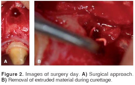 Indicationsforapical curettage treatment are persistence of symptoms and presence of bone lesion.3-5 From the endodontic perspective, retreatment should always be considered before surgical treatment, since there is evidence of greater healing rate in cases where re-treatment was performed before apical surgery.6