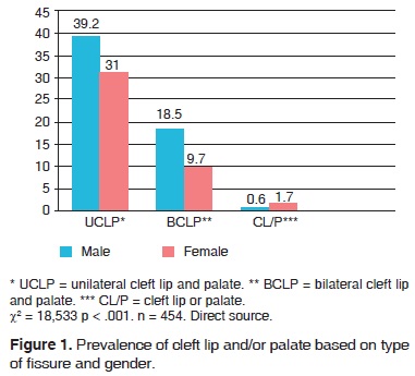 With respect to fissure type prevalence we found that Dr. Anderson11 reported 45.0% prevalence for cleft lip and palate, 31.6% for cleft lip and 23.3% for cleft palate. These results differ from those obtained in our study, since we found a very high cleft lip and palate prevalence (98.5%) and very low prevalence in isolated cleft lip or palate (1.5%).