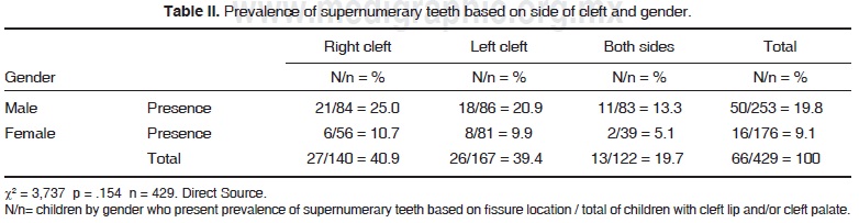 Prevalence of supernumerary teeth on the side of the fissure amounts to 97% (n = 66); distributed in 40.9% in the right side, 39.4% in the left side and 19.7% in both sides. No statistically significant difference was observed with respect to presence of supernumerary teeth according to the side of the fissure (χ2 = 3,737, p = .154) (Table II).