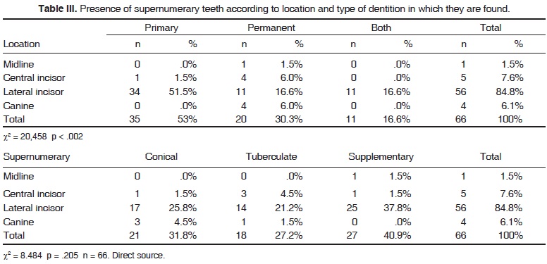 With respect to morphology of supernumerary teeth and their location, it was found that 1.5% was located in the midline region; 1.5% were of the supplementary type, 7.6% corresponded to the region of the central incisor, 1.5% exhibited conical shape, 4.5% tuberculate shape, and 1.5% were supplementary. 84.8% was present in the lateral incisor region; 25.8% were of conical shape, 21.2% presented tuberculate shape and 37.8% were of supplementary type. Finally, 6.1% were found in the canine region; 4.5% were of conical shape, and 1.5% of tuberculate shape. No statistically significant difference was observed with respect to the type of morphology and location in which supernumerary teeth could be found (χ2 = 8.484, p = .205) (Table III).