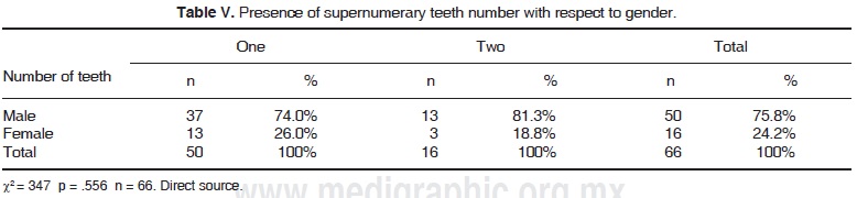 It was found that in most patients at least one supernumerary tooth was present, this percentage was 75.8%, distributed in 74.% for males and 26.0% for females; 24.2% of all cases exhibited two supernumerary teeth, 81.3% in males and 18.8% in females. No statistically significant difference was found with respect to presence of supernumerary teeth based on gender (χ2 = 347, p = .556) (Table V).