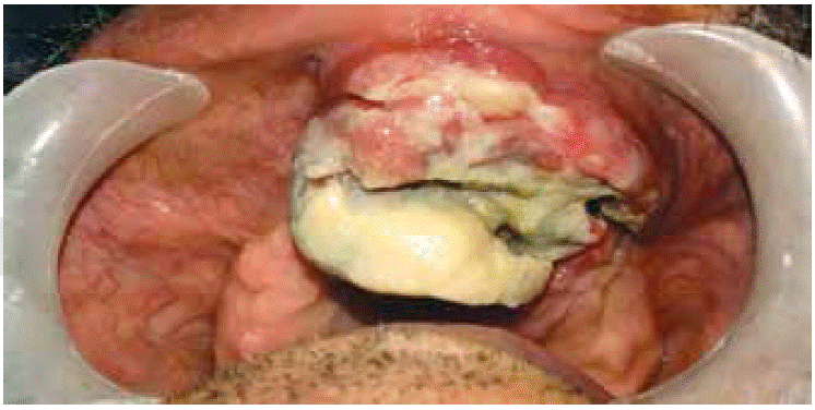 Figura 1: lesión tumoral en maxilar superior. se evidencia el espacio que ocupa intrabucalmente, observándose eritematoso con auperficie necrótica ulcerado.