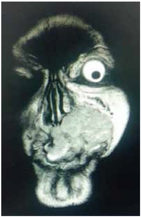 Figura 2: Resonancia nuclear magnética de paciente. se observa lesión tumoral que ocupa maxilar izquierdo, fosa nasal izquierda, hasta la región infraorbitaria.