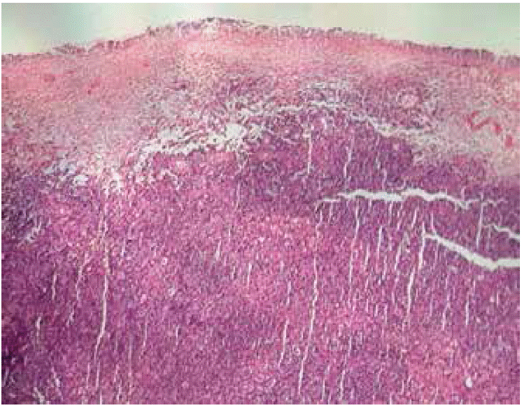 El carcinoma sarcomatoide se mencionó por primera vez en 1935 por Martin y Stewart,2 quienes asociaron su etiología a radiación previa, pues de ocho pacientes, seis fueron sometidos a radioterapia, además del tabaquismo y alcoholismo. Epidemiológicamente presenta mayor frecuencia entre la quinta y la séptima década de la vida, con predilección por el sexo masculino.1 Clínicamente el carcinoma sarcomatoide suele presentarse con síntomas obstructivos como disfagia y disnea, por presencia de pólipos de rápido crecimiento, con diámetros de hasta 15 cm, con superficie normal o ulcerada, normalmente pedículados. 3,4