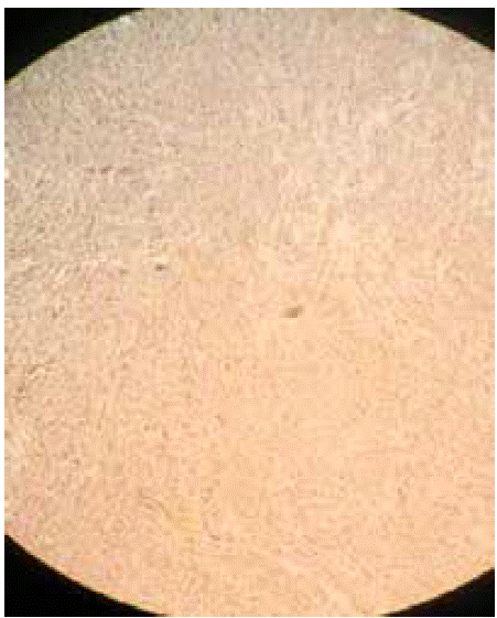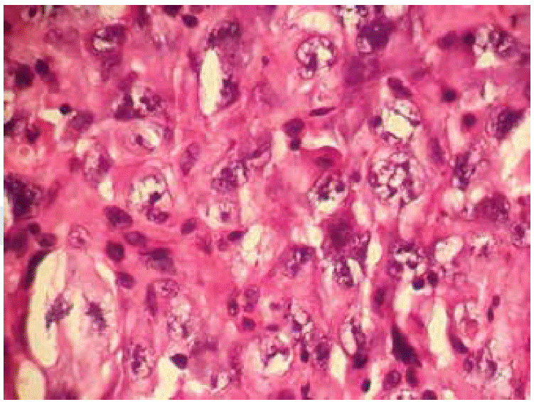 Figura 3: Tumor maligno de alto grado, representado por células grandes con citoplasma eosinofílico amplio, núcleos pleomórficos, con nucléolo prominente que se disponen en sábanas, con una elevada tasa mitótica.