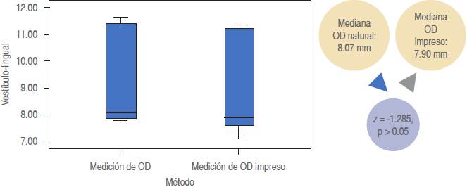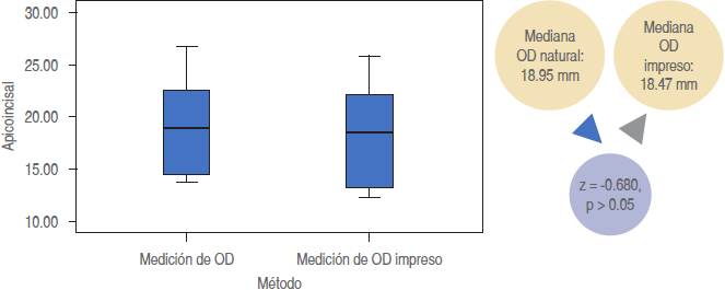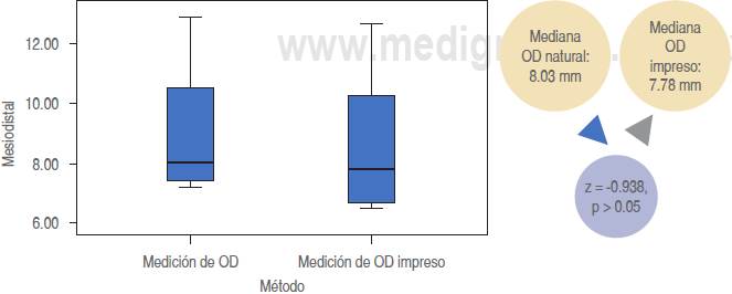En todas las comparaciones de las medianas de las medidas apicoincisales, mesiodistales y vestíbulo-linguales, el OD real siempre fue el de mayor tamaño; sin embargo, desde el punto de vista estadístico esta diferencia no fue significativa en todos los casos.