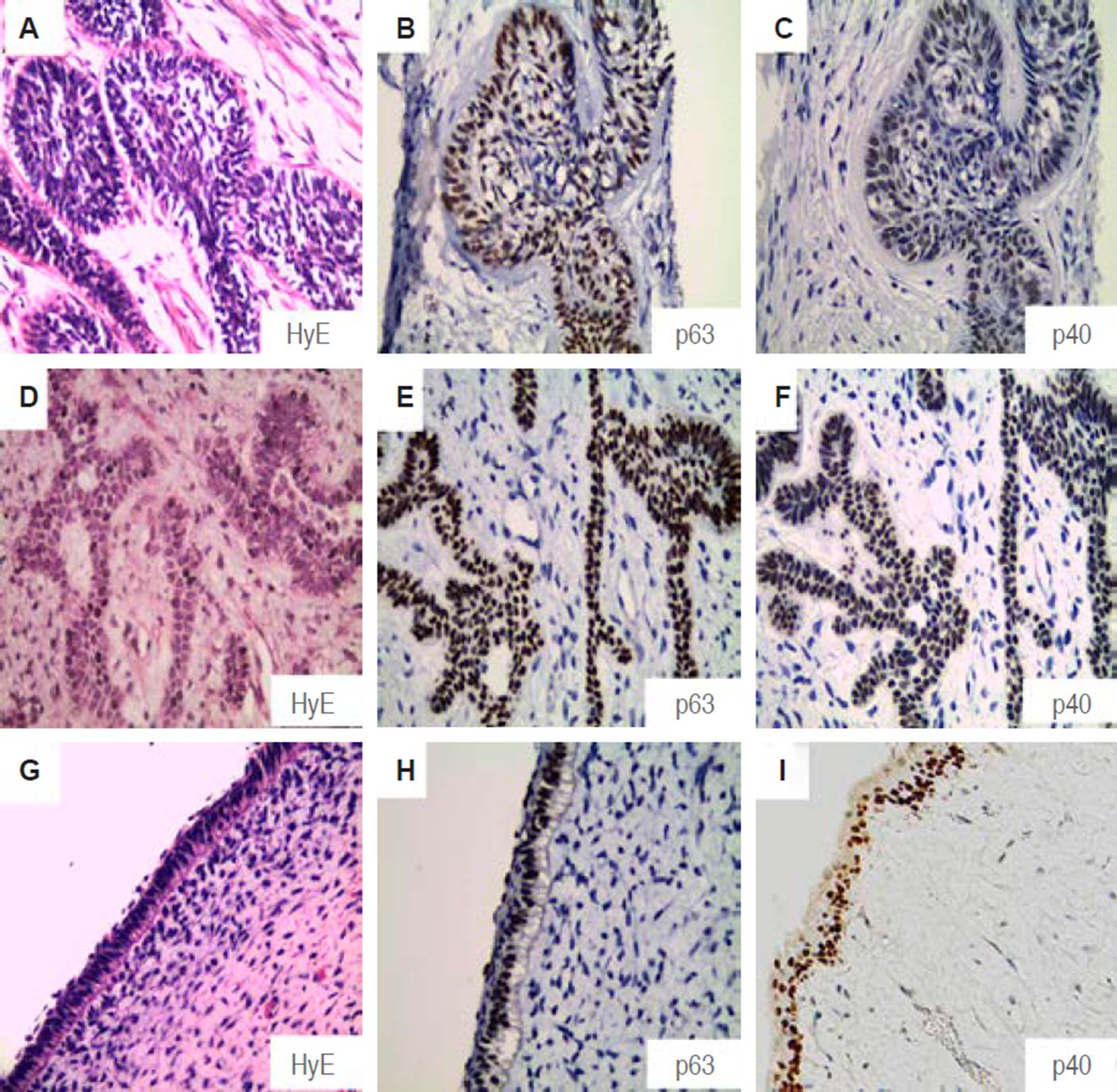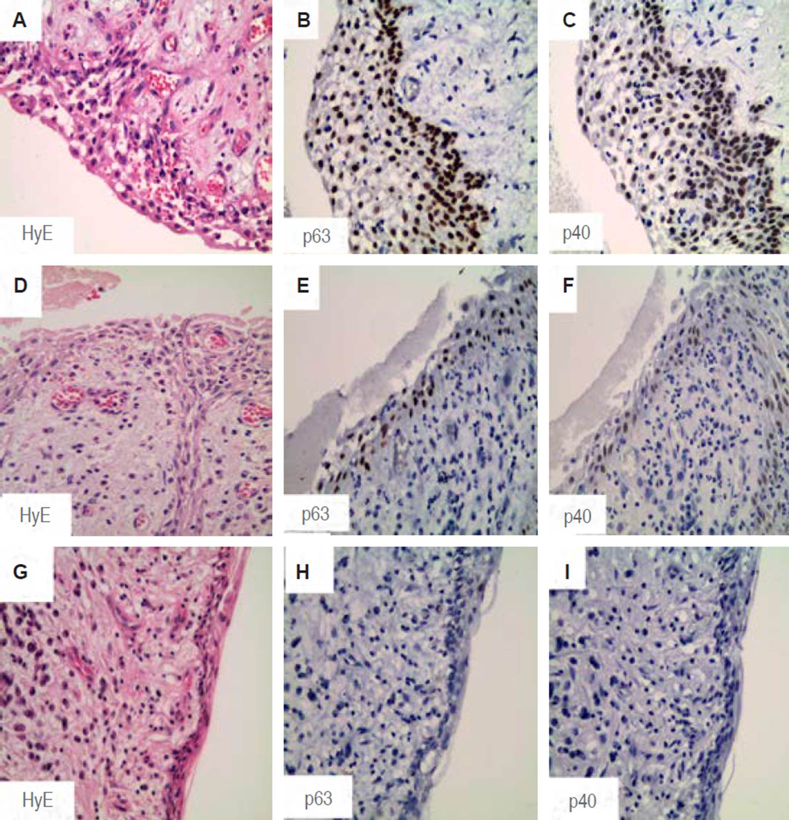 En AME y FA p63 y p40 fueron positivos en todas las células epiteliales neoplásicas (puntuación 2); sólo un caso de AME mostró positividad con una intensidad débil. El TOP mostró p63+/p40+ en el componente epitelial (puntuación 2) con la excepción de algunas zonas del estrato superficial (Figura 1).