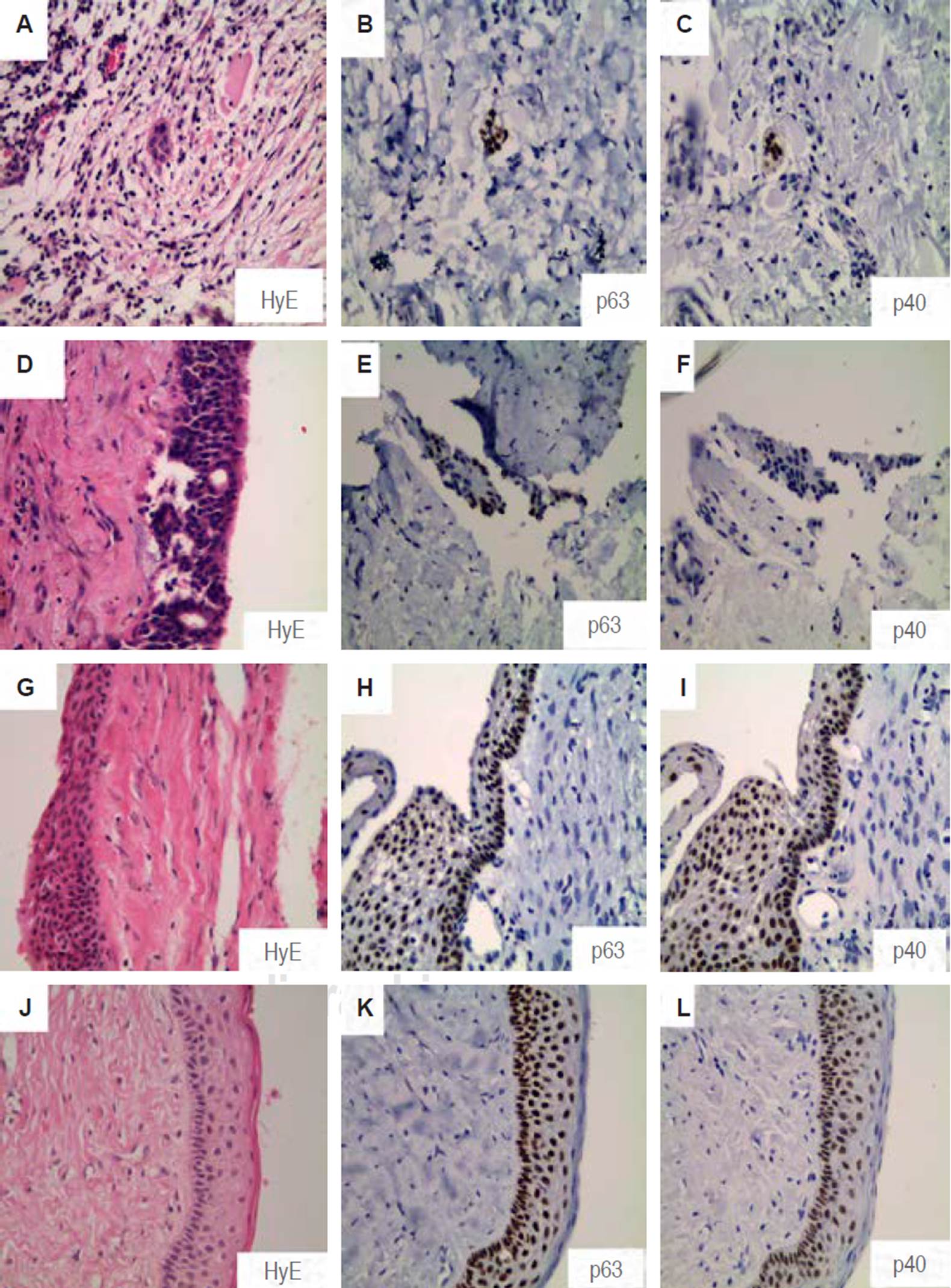 Figura 2 Quistes odontogénicos del desarrollo. A-C) Nidos epiteliales presentes en la pared de un quiste. D-F) Quiste odontogénico glandular. G-I) Quiste dentígero. J-L) Queratoquiste odontogénico. Aumento original: x 400.