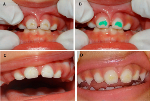 Resultados: se logró recubrir la hipomineralización del esmalte presente en las superficies de los dientes 51 y 61; al mismo tiempo se preservó la estructura dentaria (Figura 1C). En la Figura 1D se presenta el resultado del tratamiento estético y preventivo de mínima invasión, a los seis meses de seguimiento.