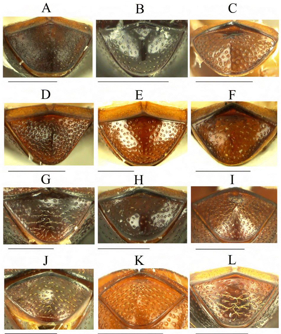 Figura 10 Pigidio. A) C. altus, B) C. andradei, C) C. buriticaorum, D) C. campbellorum, E) C. escobari, F) C. foveatus, G) C. humidus, H) C. medinae, I) C. parvus, J) C. pulidoae, K) C. pumilus, L) C. cephalopunctatus. Escala: 0.5 mm.