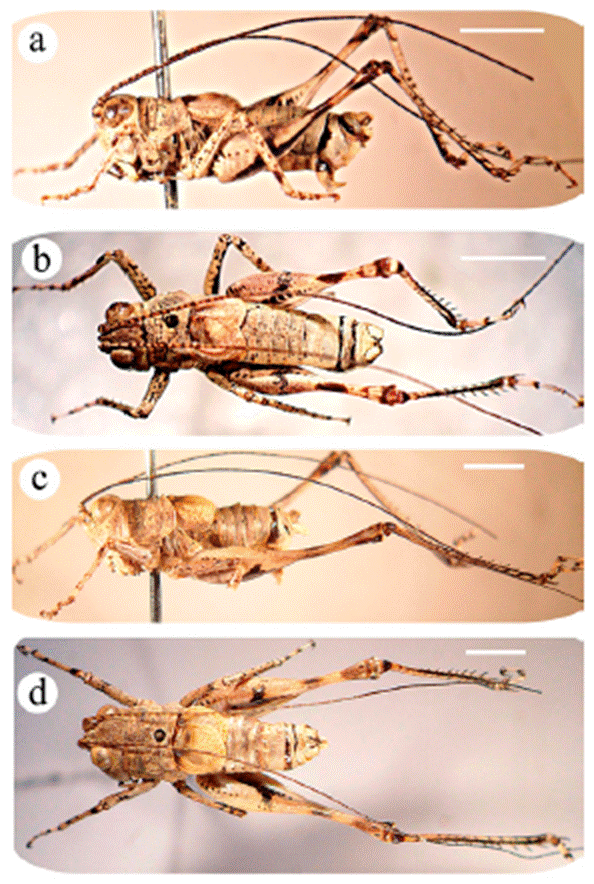 Figura 1 a, b) Macho de Platydecticus elguetai sp. n. (holotipo); c, d) macho de Platydecticus atelcura (holotipo). a, c) Vista lateral; b, d) vista dorsal. Barras de escala = 3 mm.