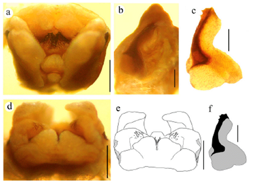 Figura 4 Titilador de Platydecticus elguetai sp. n. a) Vista posterior, muestra los lóbulos medios con espinas; b) vista lateral izquierda; c) esclerito lateral izquierdo desagregado; d) vista dorsal; e) esquema en vista dorsal; f) esquema del esclerito lateral izquierdo. Barras de escala a, d, e = 0.5 mm; b, c, f = 0.2 mm.