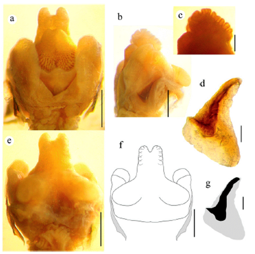 Figura 5 Titilador de Platydecticus atelcura sp. n. a) Vista ventral; b) vista lateral derecha; c) ápice del lóbulo medio dorsal con crenulaciones; d) esclerito lateral izquierdo desagregado; e) vista dorsal; f) esquema en vista dorsal; g) esquema del esclerito lateral. Barras de escala a, b, e, f = 0.5 mm; c, d, g = 0.2 mm.
